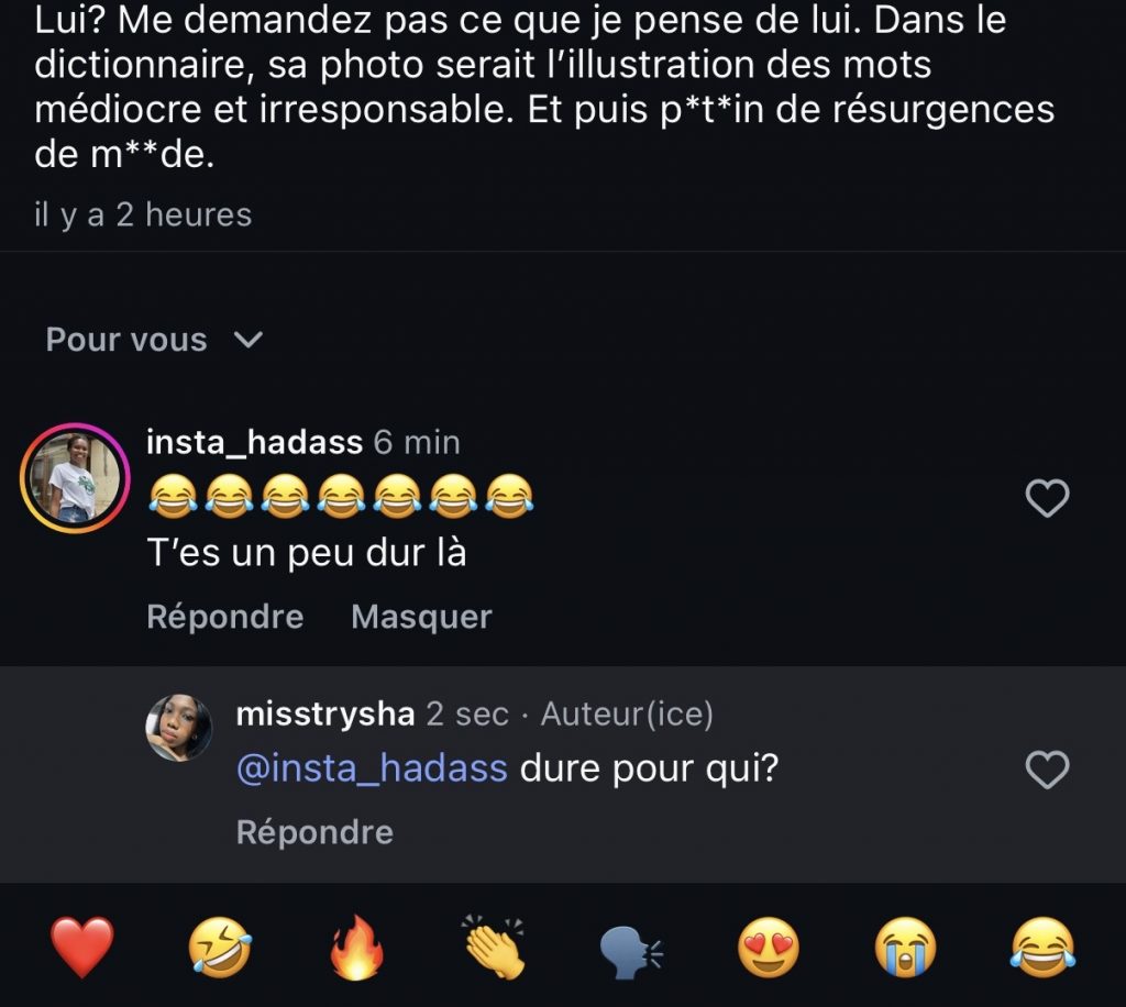 Dire « tu es dure », ce n’est pas une observation neutre. C’est une injonction camouflée. C’est une façon déguisée de dire : « ce que tu dis me met mal à l’aise, donc ajuste-toi. ». Et le plus révélateur, c’est la forme. La flopée d’émojis, le ton faussement doux et l’enrobage prétendument « bienveillant ». Mais ce n’était pas une tentative de compréhension. C’était une tentative de correction pour rendre mon propos plus acceptable, plus lisse et plus confortable pour elle. Et sa dernière réponse le confirmait sans ambiguïté : « Oh, elle nous fait une tempête émotionnelle. Câlin bichette ». Fuck you, va faire des câlins à tes parents.